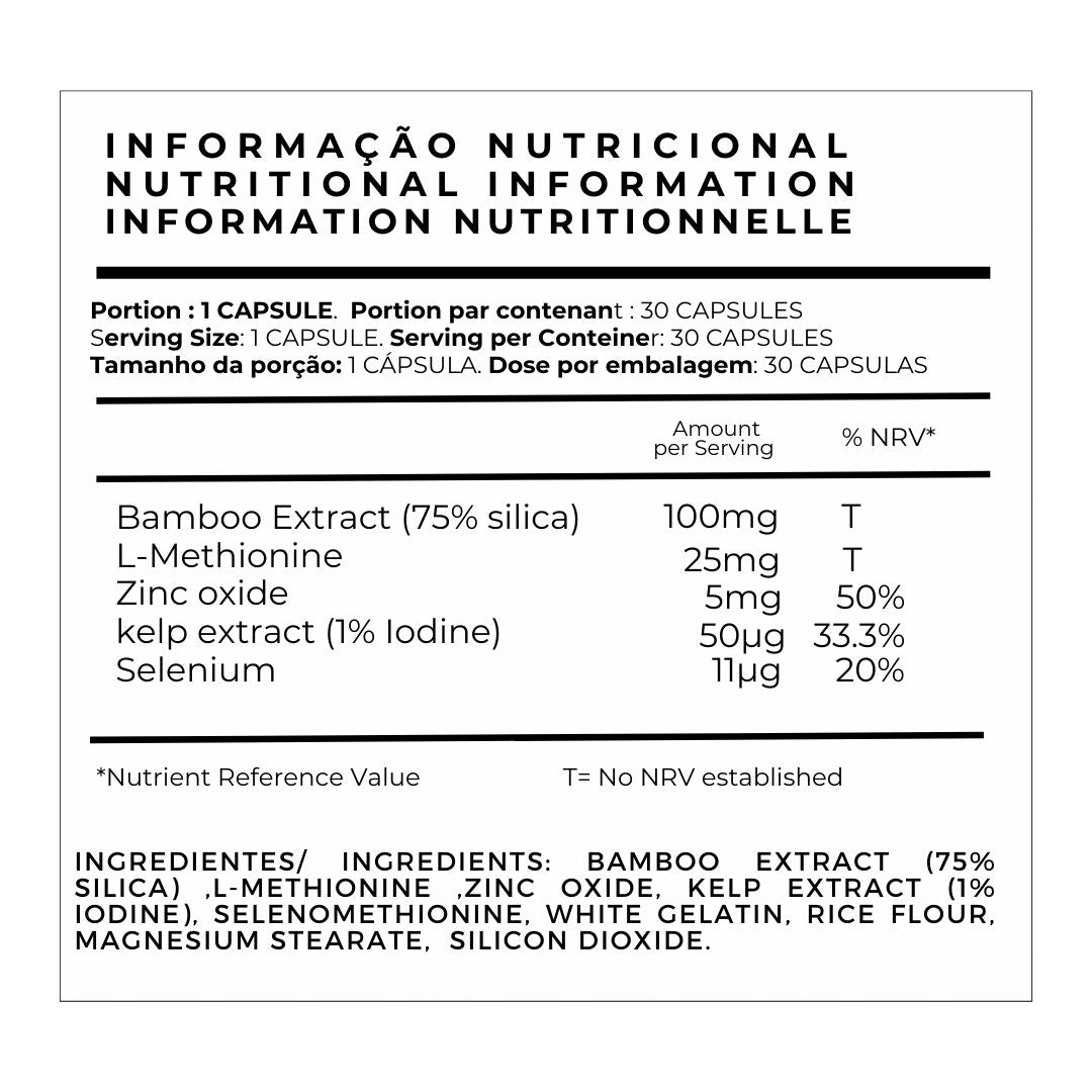 Bamboo Extract (75% Silica) ,L-Methionine ,Zinc Oxide, Kelp Extract (1% iodine), Selenomethionine, White Gelatin, Rice Flour, Magnesium Stearate, Silicon Dioxide.