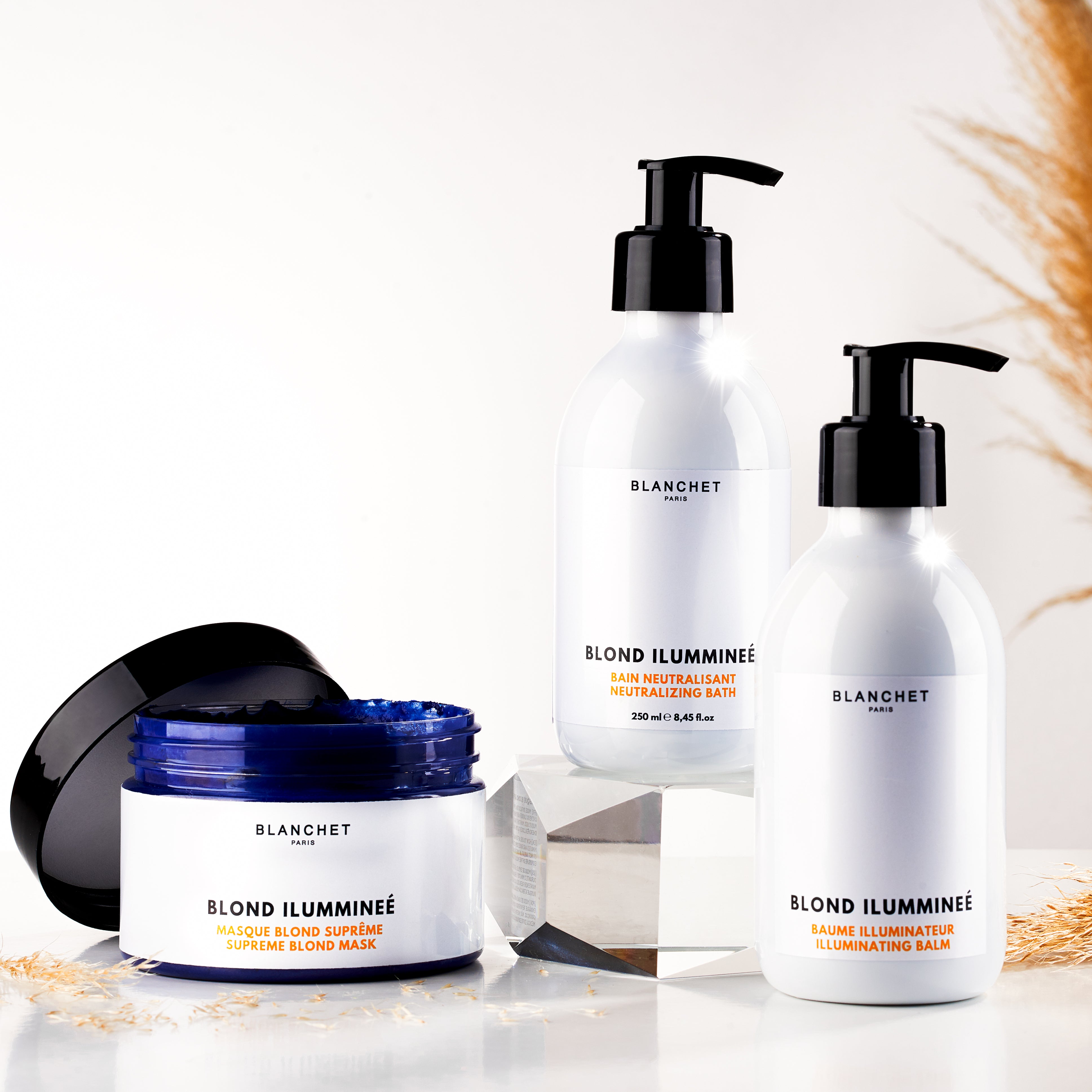 A gama BLOND ILUMMINÉE proporciona à fibra um cuidado imediato e uma ação neutralizadora de falsos reflexos para um loiro ideal.